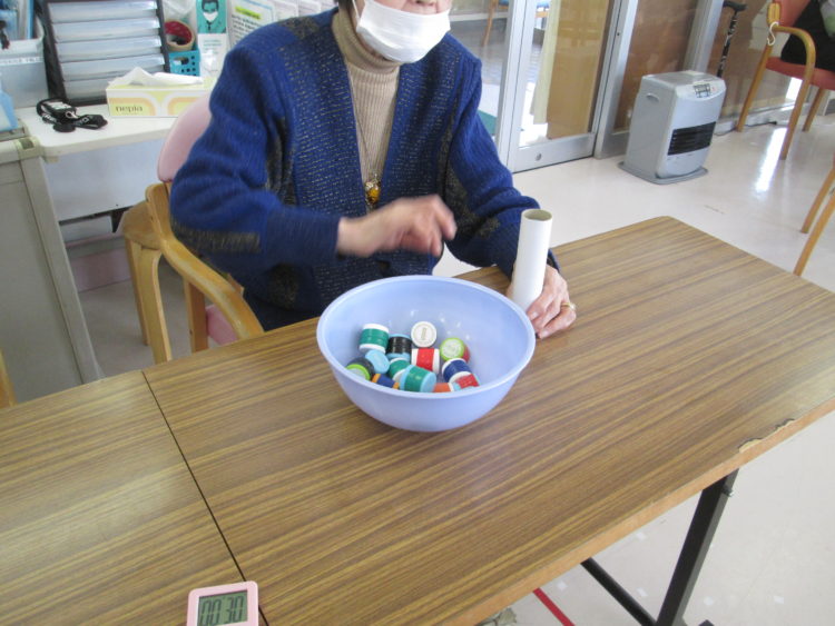 長い筒の中にペットボトルの蓋をいれ何個積み重ねたかを競う競技です!