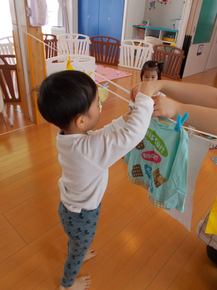 洗濯ごっこでは洗濯ばさみを使って洋服を干す作業に挑戦!!