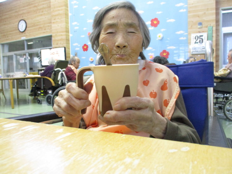 顔を拭き拭き…自分で出来る方には出来るだけ自分で行えるように手伝っています。