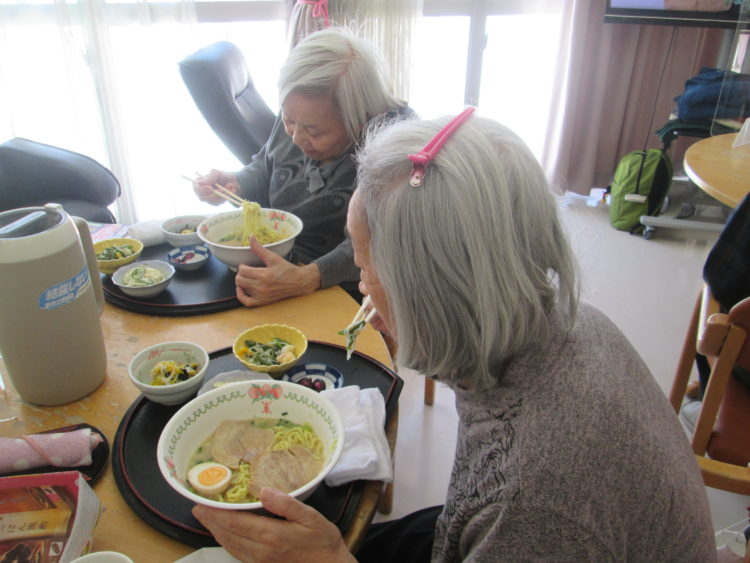 今日はお昼になんと豚骨ラーメンが出ていました!みなさん美味しそうに召し上がっており、私たちまでお腹がすいてしまいそうでした。召し上がっている様子を撮らせていただきました。