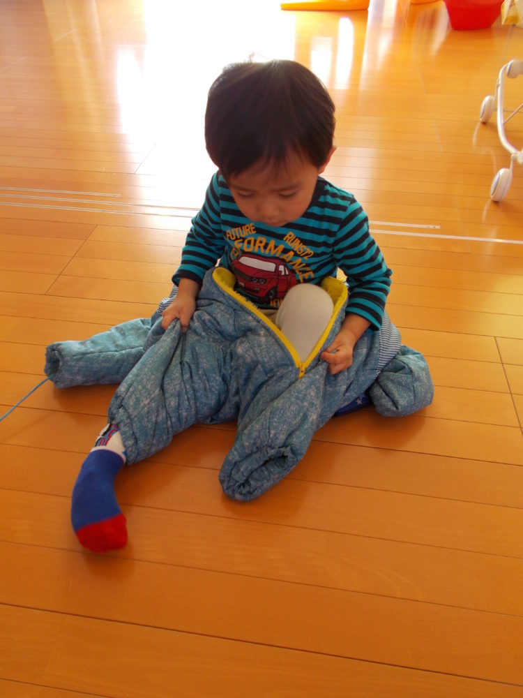 雪あそびの身支度にも慣れ、少し手伝ってもらいながらも自分で上手に靴下やジャンプスーツを着ています☆