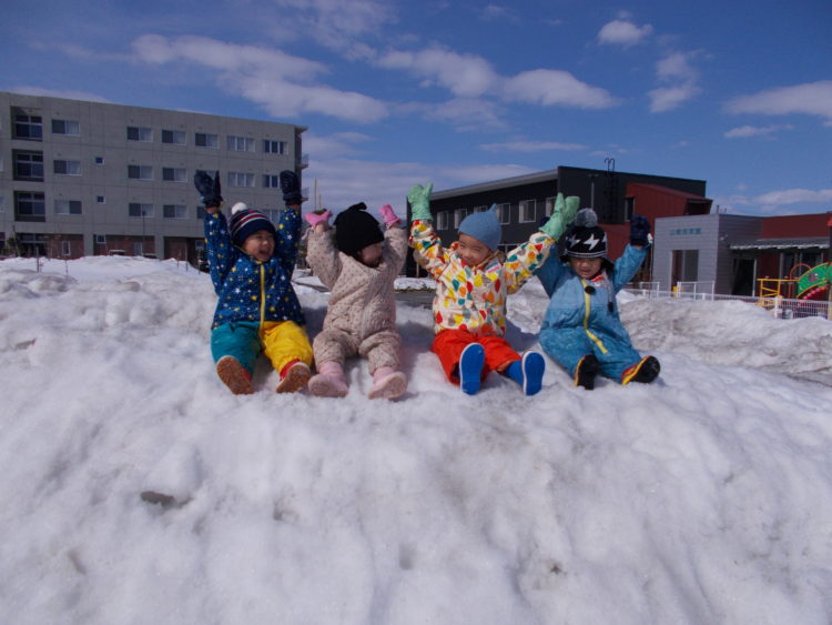 「3、2、1…!!」とみんなでカウントダウンし一斉に滑り降りたり、雪あそびを満喫していました(*^。^*)