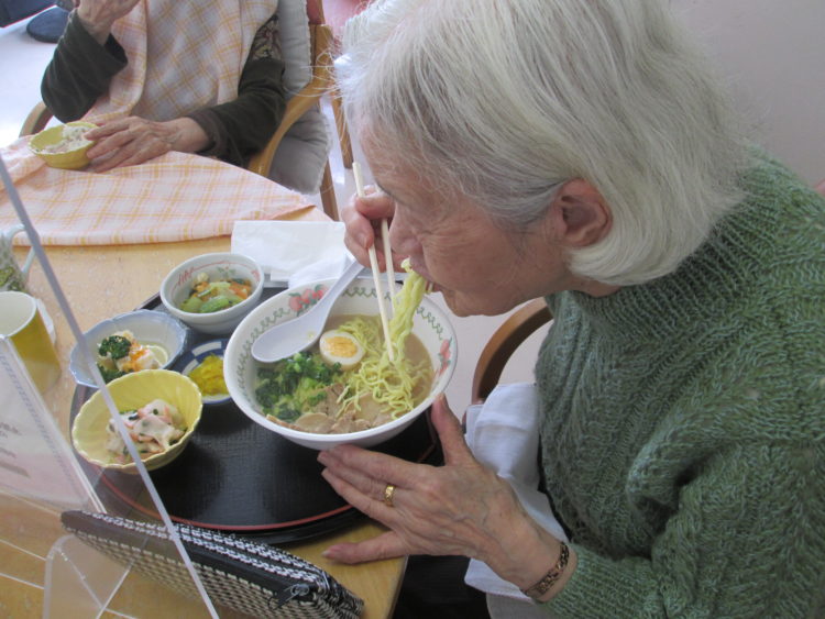 みなさんこんにちは!今日のデイサービスの昼食は、麵シリーズ:豚骨ラーメンです。今まで醤油、味噌ラーメンと提供していましたが・・・・・全てお客様から大好評でした。さて今回はどうでしょうか? こちらが豚骨ラーメンです。さて皆様の反応はどうでしょうか、気になるところです。