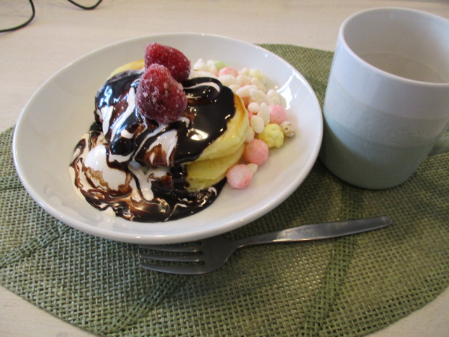 本日は職員からの差し入れの「北海道産小麦のパンケーキミックス」でお店のようにはいきませんが、お客様に喜んで頂こうと少しリッチお茶会にしてみました。