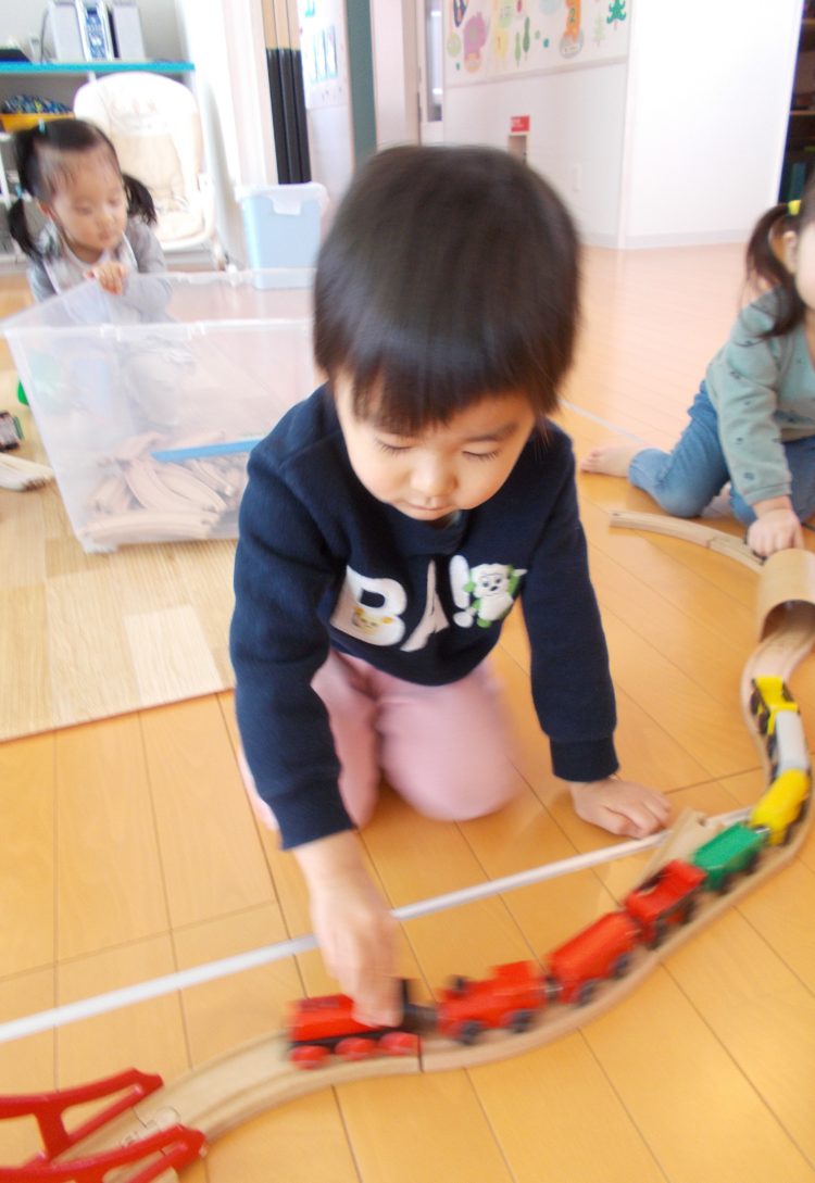 登園後の朝の遊びは、子ども達に大人気の電車のおもちゃ★
