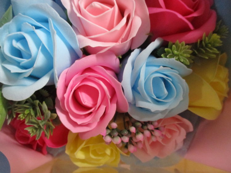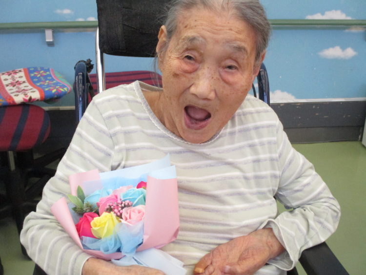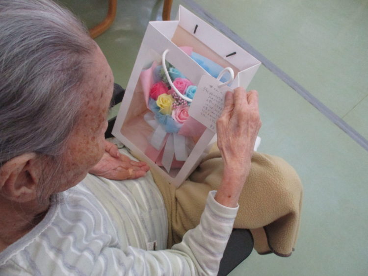せっけんの香りがする観賞用の花束をみて、「これは枯れてなくなる事が無いからずっと見てられるね」と笑顔で話されておりました。