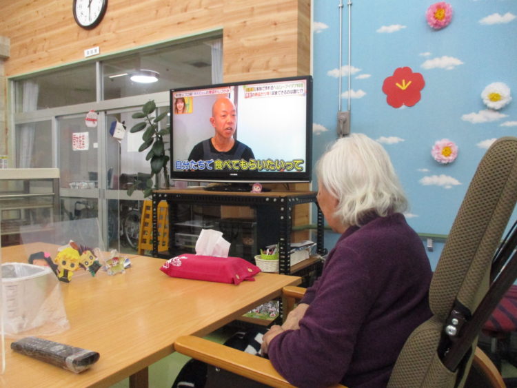昼食を食べ終え、お部屋に戻るまでテレビを視聴されるM様。お腹がいっぱいになったのか、とても満足そうにお部屋に戻って行かれました。