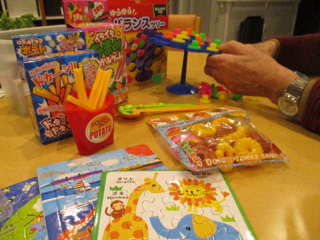 パズルやイライラおまめ、バランスツリーにつんでドーナッツ等々、お客様の脳トレや指先の運動を兼ねたゲームは100円ショップに出掛けた時に、無理なく楽しめる物を買い集めた物です。