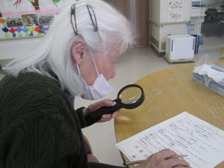 そう、このお方 K・S様です。ちょっと字が見づらいと話し虫眼鏡を使用しての取り組み姿勢はとても真似することはできません。そして着々と文字を埋めていっております。出来上がったプリントを見ると全集中だけに全問正解しておりました。恐るべし正解率・・・・・私自身も驚いて拍手と関心するばかりの時間でした。
