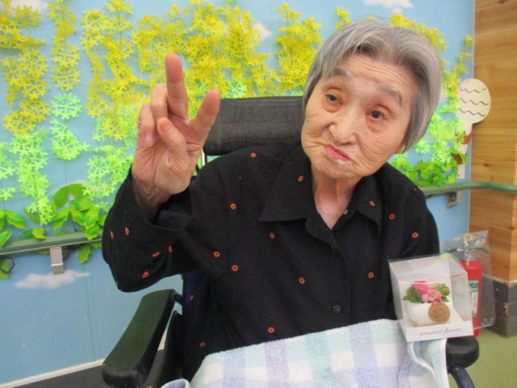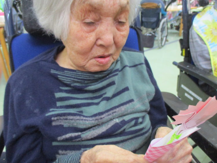 M介護士にお願いしてお花の折り紙を折ってもらいましたので、お客様に見てもらい一緒に写真を撮らせて頂きました。