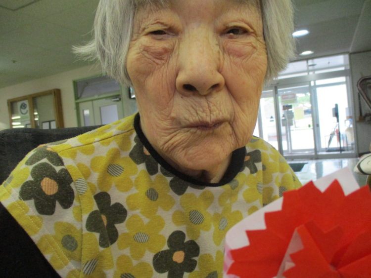 M様です。とても良い表情を見せてくれました。お花の折り紙を手渡すと少し嬉しそうでした。。。