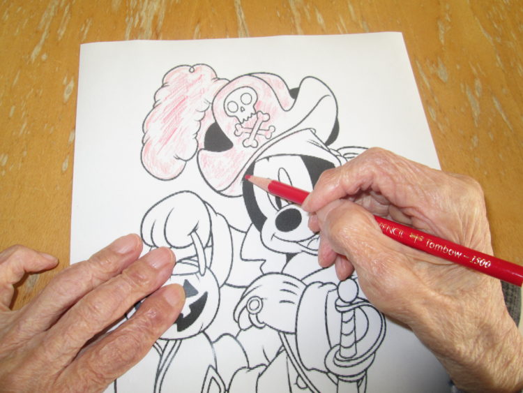 皆さん、こんにちは。今日のデイサービス午後のレクリエーションは脳トレです。皆さんそれぞれで問題を解いてる方もいれば塗り絵をしている方もいらっしゃいます。今回は塗り絵をしているM・O様を観察してみました。早速ミッキーマウスの塗り絵を手にとり・・・・・いざ開始。帽子を赤色に塗っております。塗る作業もとても滑らかな手つきで進んでおります。と思ったら急に手が止まりました。ん、どうしたんでしょうか?