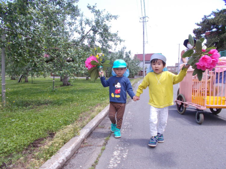 花束作りの様子を見ながら一緒にお散歩、うさぎ組のSちゃんもとっても楽しそうです(#^.^#)