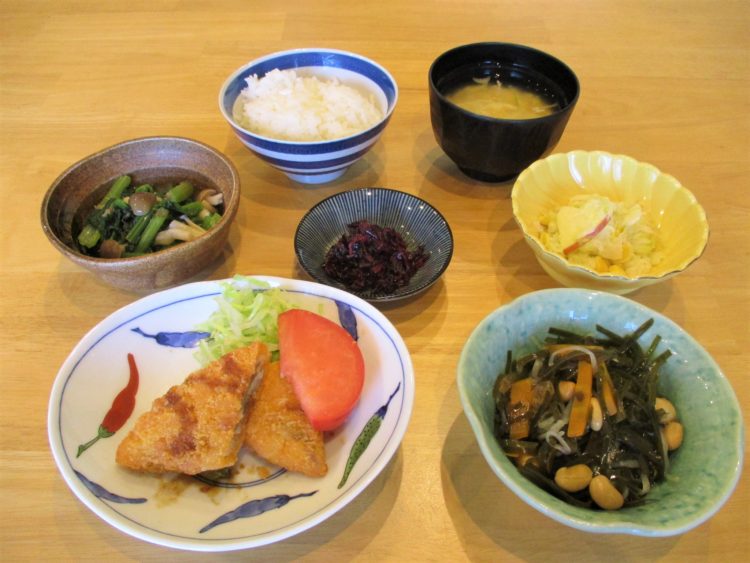 ご飯、かきたま汁、白身魚フライ、大豆五目煮、小松菜のお浸し、