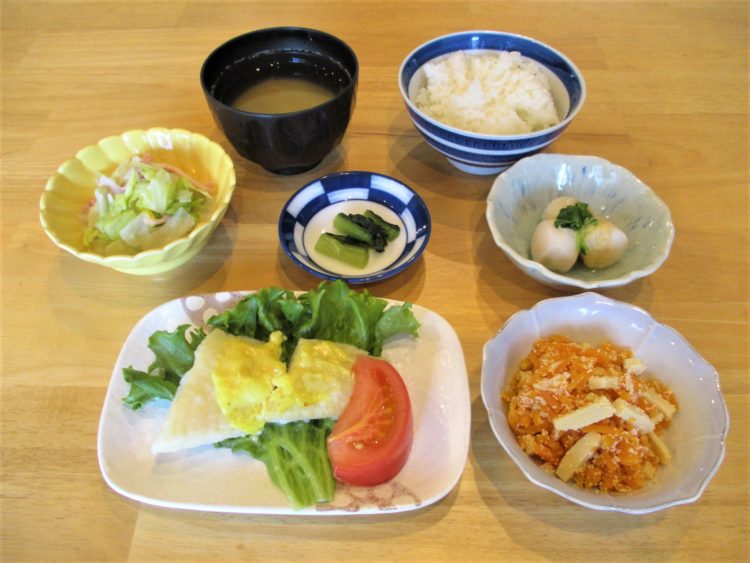 ご飯、舞茸のみそ汁、カレイのカレー風味焼き、人参の子和え、里芋の田楽、