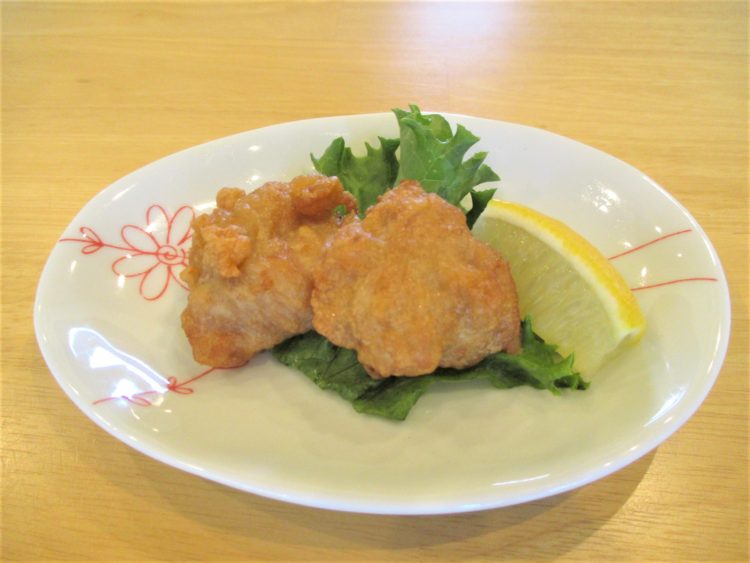 ご飯、中華風スープ、鶏肉の唐揚げ、ぜんまいの煮物、小松菜のお浸し、