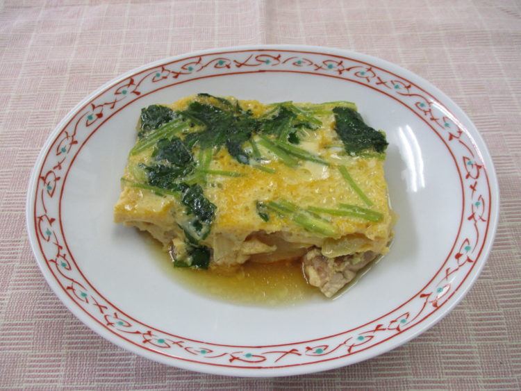 ご飯、キャベツと油揚げのみそ汁、鶏肉の親子煮、いんげんとえびの炒め物、胡瓜とたこの和え物、ごま豆腐、赤かぶ漬