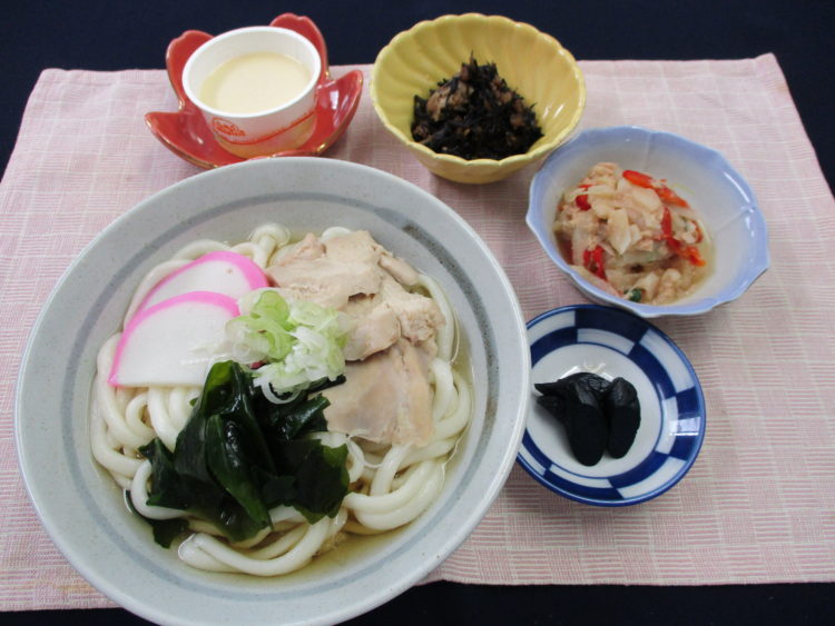 かしわうどん、大根とツナのサラダ、五目ひじき煮、なす漬、豆乳プリン