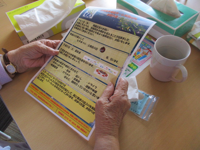 7月の行事予定表が完成しましたので、お客様へお渡ししました。