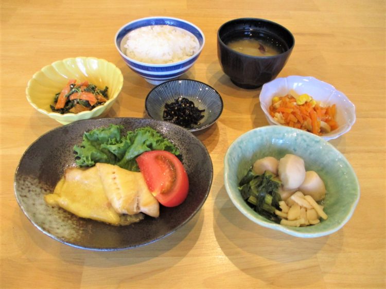 ご飯、玉ねぎのみそ汁、赤魚のチーズ焼き、里芋とイカの煮物、人参しりしり、