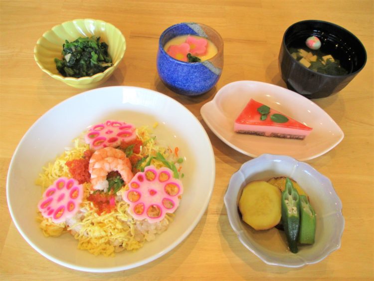 ちらし寿司、豆腐と手毬麩のすまし汁、茶碗蒸し、さつまいも煮、菜の花のお浸し、