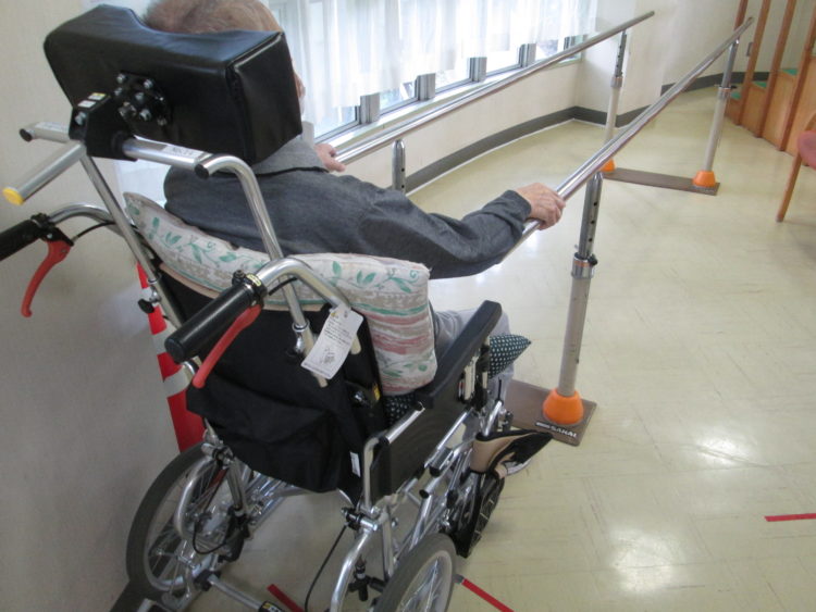 今年度に入ってからは、平行棒での歩行訓練も行えるまで機能が向上し