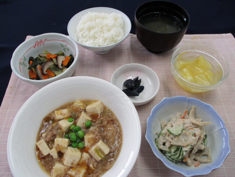 ご飯、めかぶと春雨のスープ、麻婆豆腐、チンゲン菜とイカの炒め物、蒸し鶏根菜ごまサラダ、なす漬、パイン缶