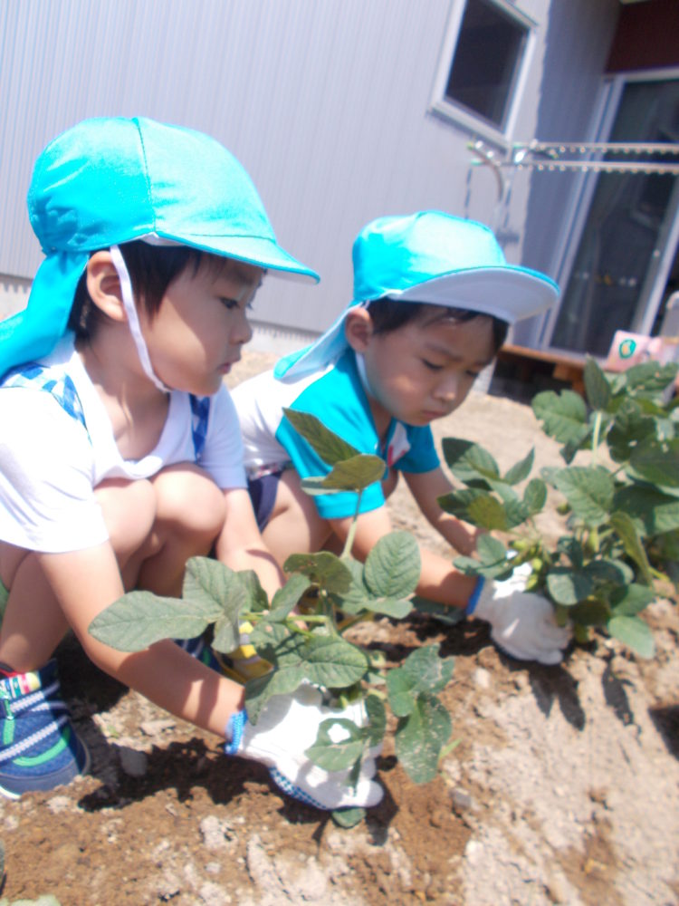 昨日の食育指導では、枝豆の収穫を体験しました。5月10日、園庭隅の菜園に植えた枝豆・・・毎日のように「おおきくなあれ」と言葉をかけながら水をかけ、大切に育ててきました。6月には殻の実が膨らみはじめ、いよいよ早生の枝豆が収穫のときを迎えました。子ども達は、軍手をはいて準備万端!!ぞう組のTくん、Kくんは実のついた枝を1本、力を込めて引き抜いてみました。
