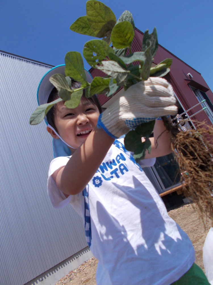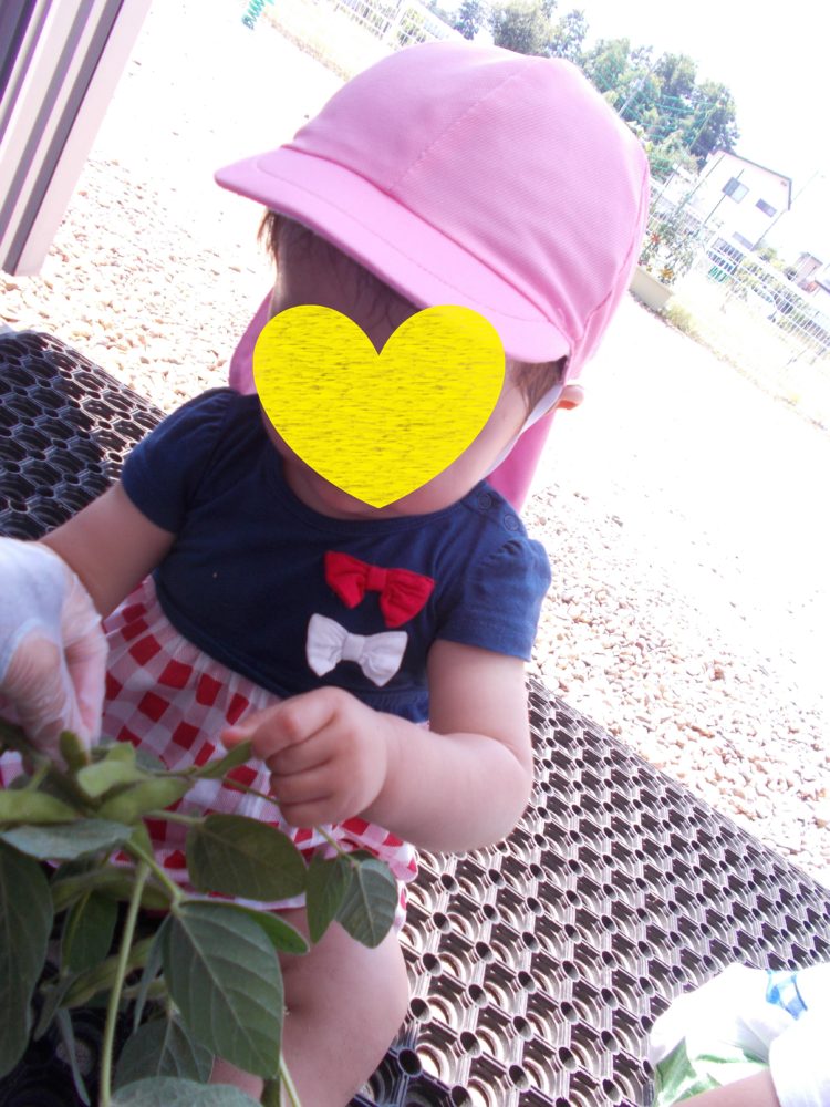 次にみんなで枝豆をはじいてみました。新鮮な殻は茎からなかなか外れてくれなかったけれど、ひとつずつ丁寧にもぎ取りました。うさぎ組のSさんもしっかりお手伝い ( ^ω^)b