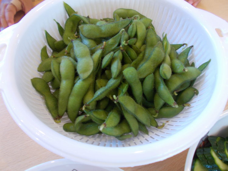 子ども達の努力の結晶はザルいっぱいになり、もぎたて茹でたてをみんなで食べました。殻付き枝豆初体験の子ども達も新鮮で甘くて味の濃い豆に魅了され、パクパクムシャムシャたくさん食べました 。゚+.(・∀・)゚+.゚