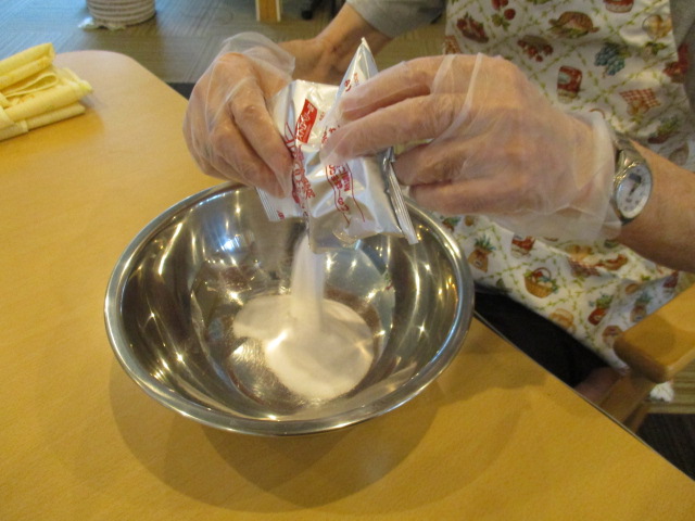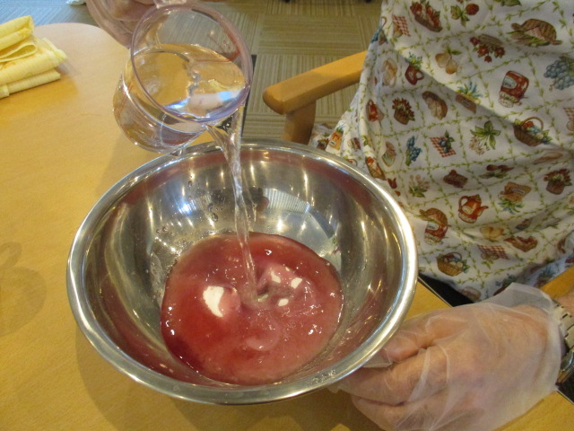 本日は手作りおやつとしてお客様と一緒にいちごゼリーを作りました。