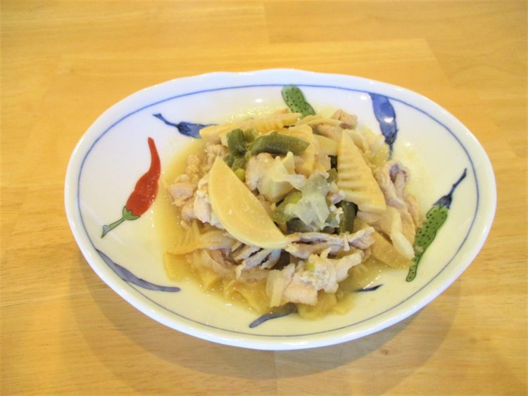 ご飯、キャベツのみそ汁、豚肉と筍の味噌煮、金時豆甘煮、ほうれん草のお浸し、