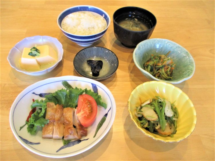 ご飯、わかめのみそ汁、鶏肉の生姜はちみつ焼き、ささげのしそ炒め、たまご豆腐、
