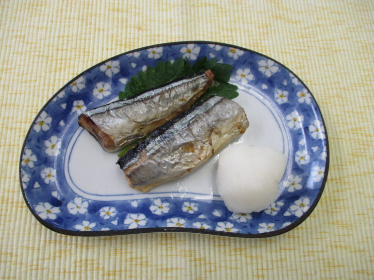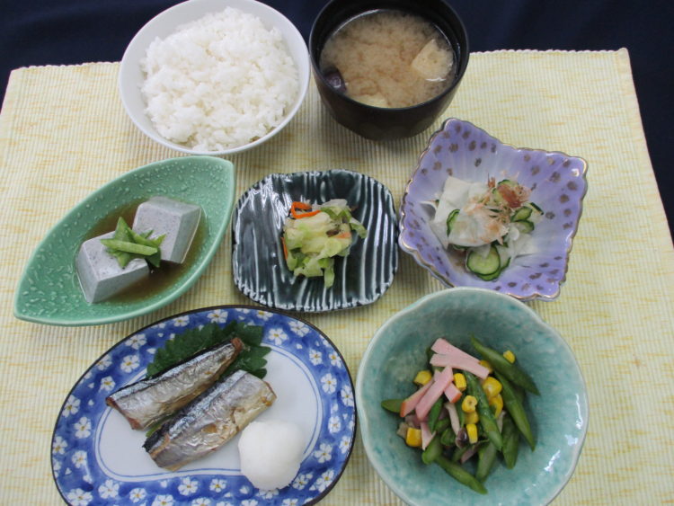 ご飯、なすと油揚げのみそ汁、さんまの塩焼き、アスパラとコーンのソテー、ごま豆腐、かぶの梅肉和え、キャベツ漬
