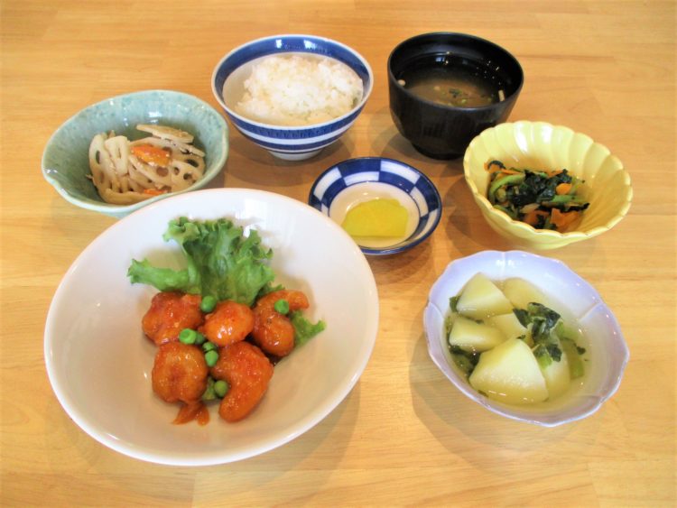 ご飯、えのきのみそ汁、えびのチリソース、じゃが芋の白煮、レンコン金平、