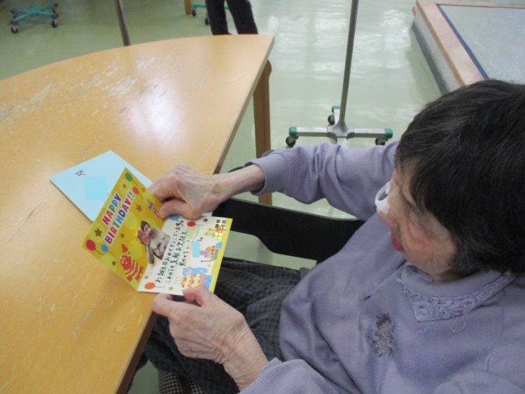 そして、居室担当から誕生日者の方にバースデーカードをプレゼントします。S様メッセージを真剣に読まれています。