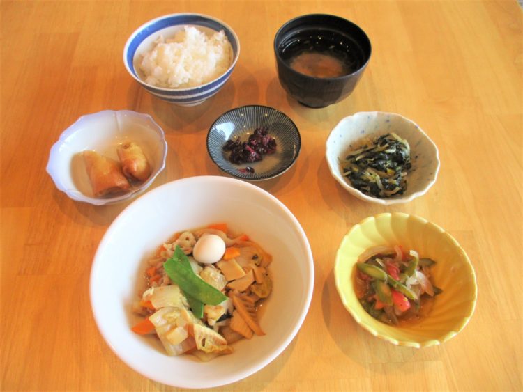 ご飯、なるとのすまし汁、八宝菜、ほうれん草の炒め煮、春巻き、