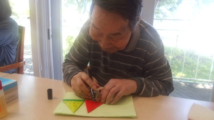 J様には折り紙でスイカを作っていただき、マジックで種を書いていただいています。