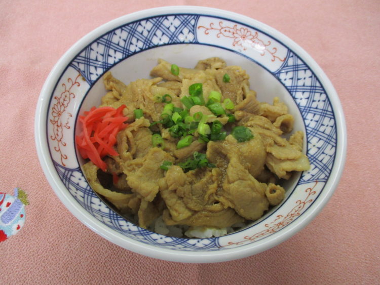 スタミナ丼、わかめスープ、春雨とれんこんのソテー、マカロニサラダ、豆腐のなめこあんかけ、つぼ漬