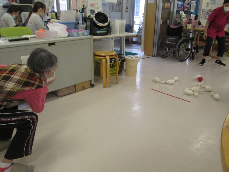みなさん、こんにちは。今日のレク活動は皆さん大好き、ボーリングです。連日オリンピックの話題で会話が弾む日々ですが・・・・・それはさておき早速、独特なフォームをしているN様。ストライクを狙って渾身の1球、投げました。そして願いはただ一つ・・・・・目の前にあるピンを全部倒すこと。さて結果は・・・・なんと願いが届きストライク。これにはN様もびっくりした様子で思わず口に手を当てていましたがと同時に笑顔もみられておりました。本当に見事な、そして素晴らしい1球でした。