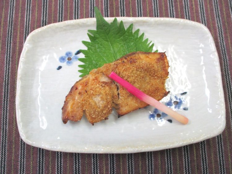 ご飯、なすと油揚げのみそ汁、あじの南部焼き、細竹の肉味噌炒め、豆腐ナゲット、オクラと長芋のおかか和え、赤かぶ漬