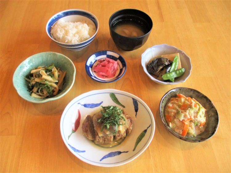 ご飯、板麩のみそ汁、和風おろしハンバーグ、メンマのソテー、なすと高野豆腐の生姜煮、