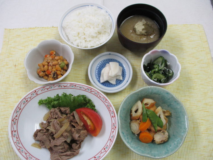 ご飯、大根ととろろ昆布のみそ汁、牛肉と玉葱のオイスターソース焼き、帆立とがんもの煮物、鶏五目豆、きゅうりとしらすの和え物、白かぶ漬