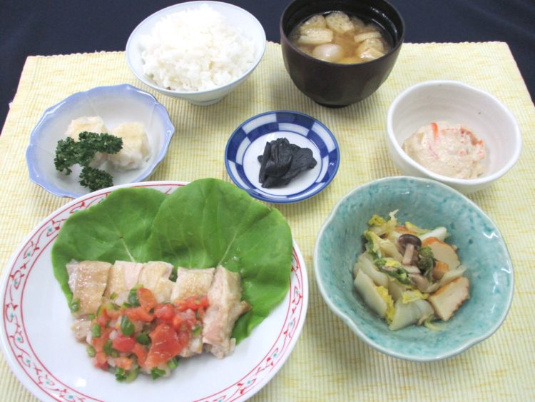 ご飯、里芋と油揚げのみそ汁、鶏肉のサルサソースがけ、白菜とさつま揚げの煮物、