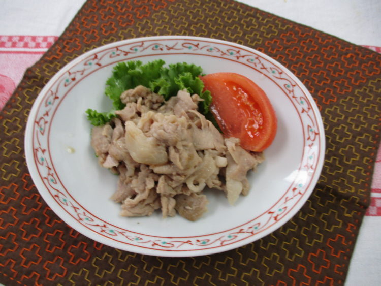 ご飯、さもだしと大根のみそ汁、豚肉の山椒焼き、れんこんの炒め煮、ちくわの磯部揚げ、杏しそ巻、キャロットゼリー