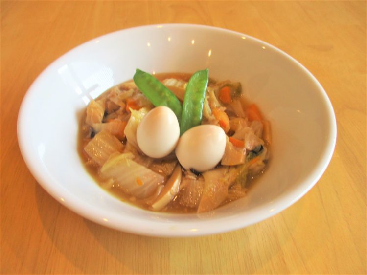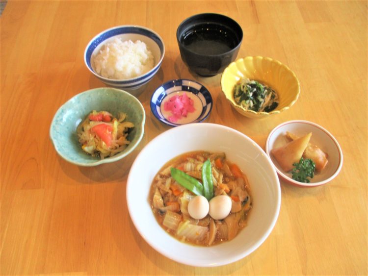 ご飯、めかぶと春雨のスープ、八宝菜、春巻き、モロヘイヤと長芋のお浸し、