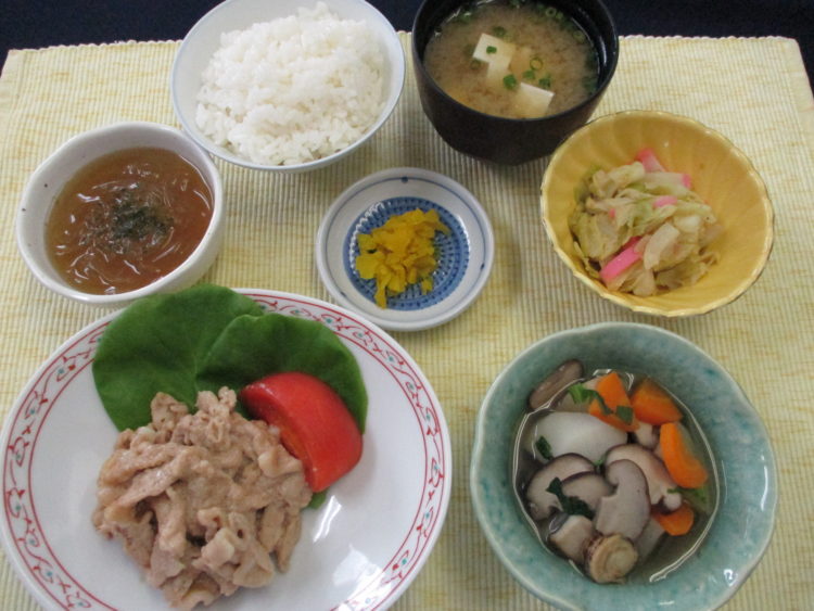ご飯、豆腐とあさつきのみそ汁、豚肉の生姜焼き、かぶと帆立の煮物、キャベツのピーナッツ和え、ところてん、つぼ漬