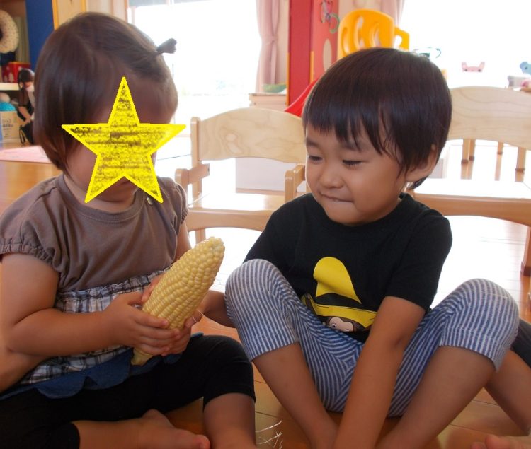 つやつやぴかぴかのとうもろこしに興味津々のSちゃん♪