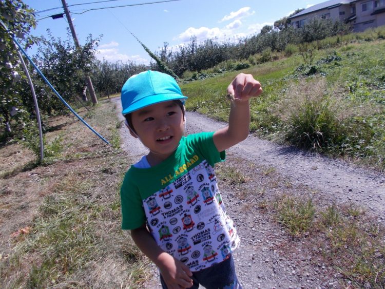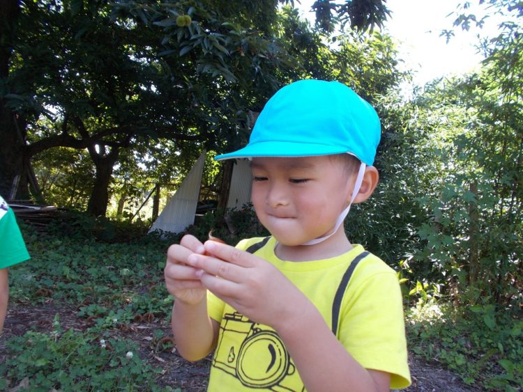 大きな天狗のうちわのような葉っぱや栗を見つけたり、大きなバッタを捕まえたりしました♪