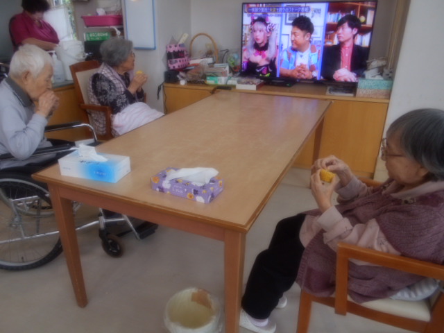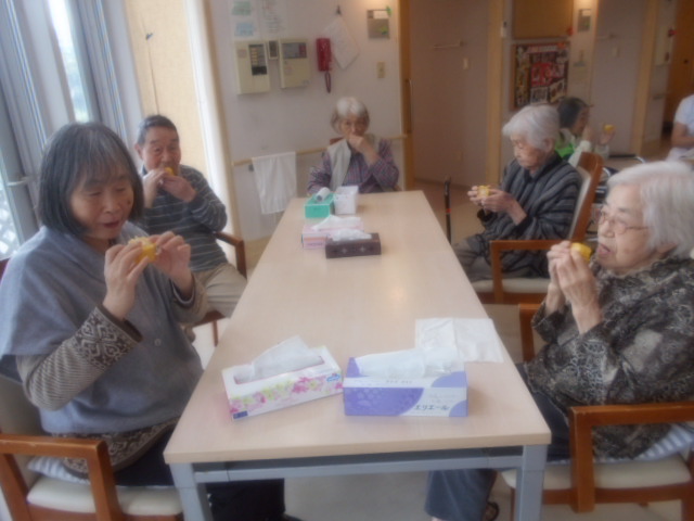 今日は、ご家族様から「嶽キミ」の差し入れがあり、おやつの時間にいただきました。